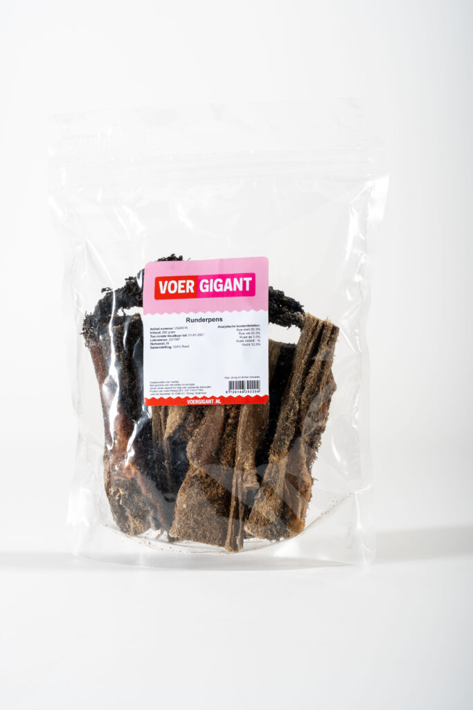De Runderpens 200 gram van Voergigant.com is een luchtgedroogde snack vol smaak en voedingsstoffen. Ideaal voor honden die houden van pure, natuurlijke beloningen.