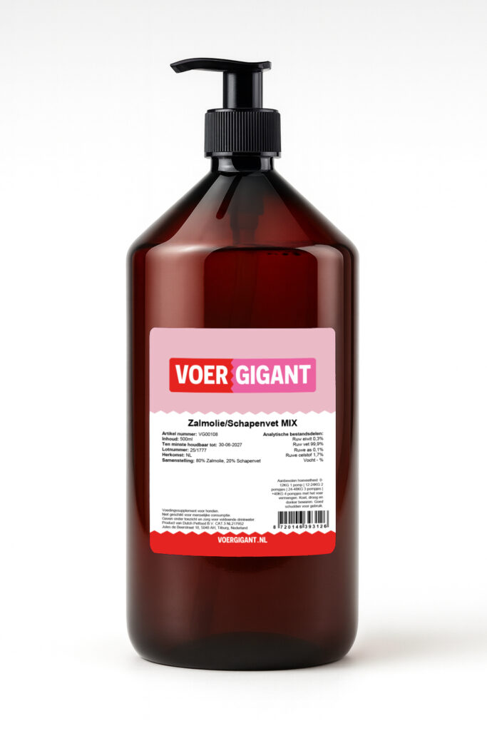 De Zalmolie/Schapenvet 500ML van Voergigant.com is een kwalitatief product voor honden, met zorg samengesteld voor smaak, gezondheid en tevredenheid.